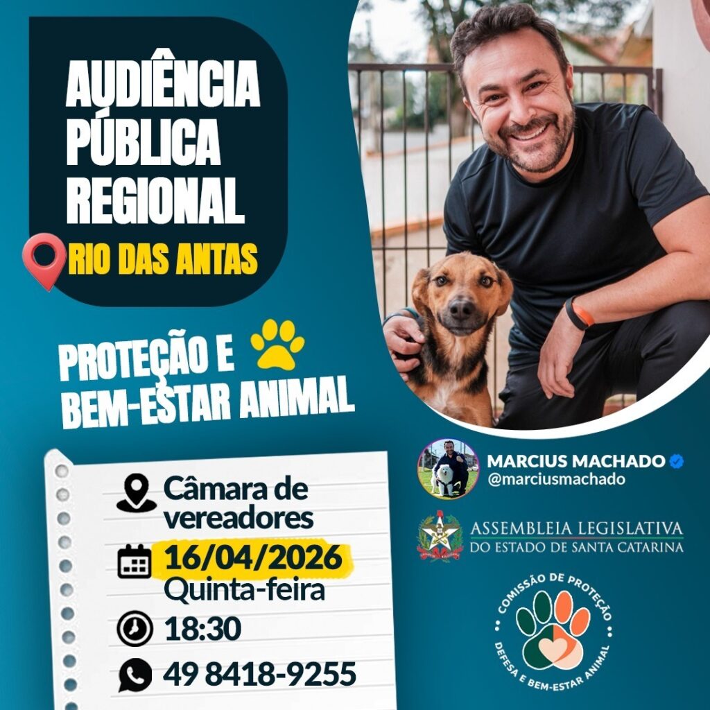 A Comissão de Proteção, Defesa e Bem-Estar Animal, da Assembleia Legislativa de Santa Catarina (Alesc), através de seu presidente deputado Marcius Machado, realiza uma Audiência Pública Regional, em Rio das Antas, nesta quinta-feira, 16, a partir das 18:30h, na Câmara Municipal de Vereadores.