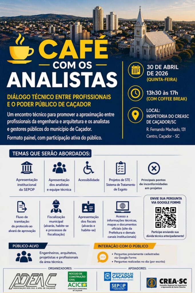 O município de Caçador receberá o evento “Café com os Analistas”, um encontro técnico voltado à integração entre profissionais das áreas de engenharia e arquitetura e analistas e gestores públicos locais.