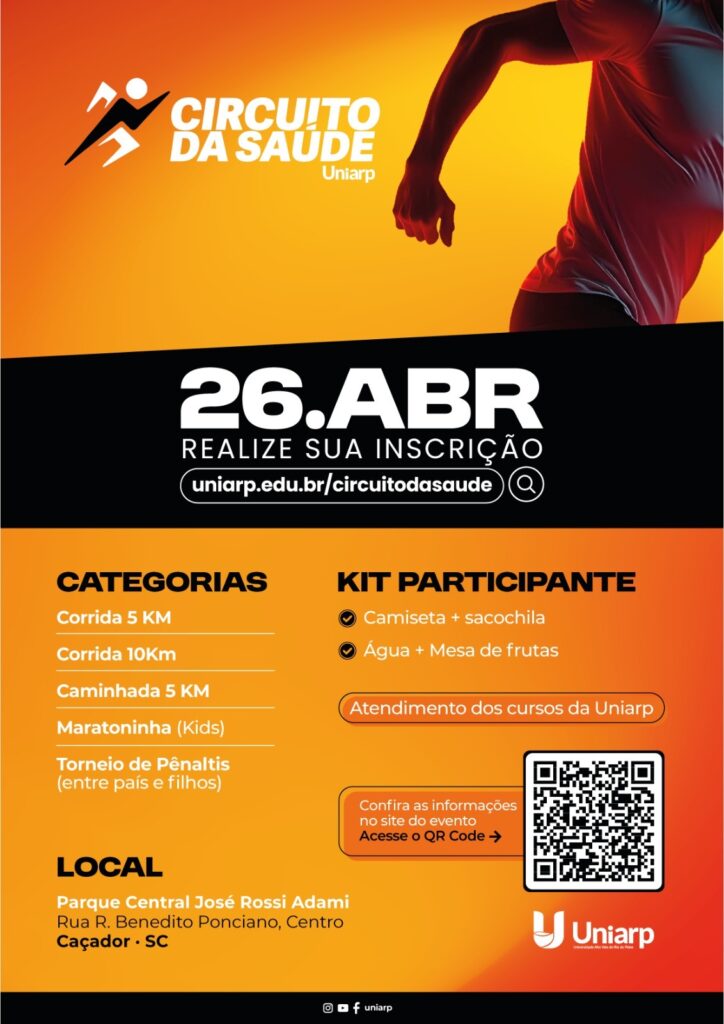 A Uniarp realiza no dia 26 de abril de 2026 o Circuito da Saúde Uniarp, no Parque Central José Rossi Adami, em Caçador, com uma programação diversificada voltada à promoção da saúde e do bem-estar da comunidade. O evento promete reunir pessoas de todas as idades em um dia de atividades esportivas, educativas e recreativas, com diversas novidades nesta edição. As inscrições estão abertas até dia 22 de abril e podem ser feitas pelo site: https://uniarp.edu.br/circuitodasaude.