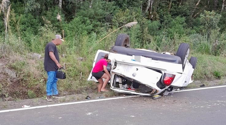 Gol com quatro ocupantes capota na pista da rodovia em Salto Veloso