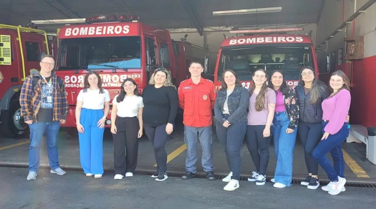 Recebidos no quartel dos bombeiros, os acadêmicos conheceram a central telefônica e os procedimentos de acionamento das viaturas, apresentados pelo bombeiro instrutor Giancarlo. Em seguida, participaram de uma sessão prática em sala de treinamento, com foco em primeiros socorros pediátricos.