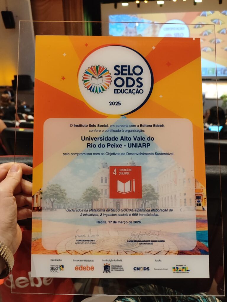 A Universidade Alto Vale do Rio do Peixe (Uniarp) recebeu o certificado pelo segundo ano consecutivo. Foram reconhecidos os projetos desenvolvidos em 2025: Educação Financeira do Estúdio de Finanças e Resgate e Preservação da Tradição das Benzedeiras e Benzedores.